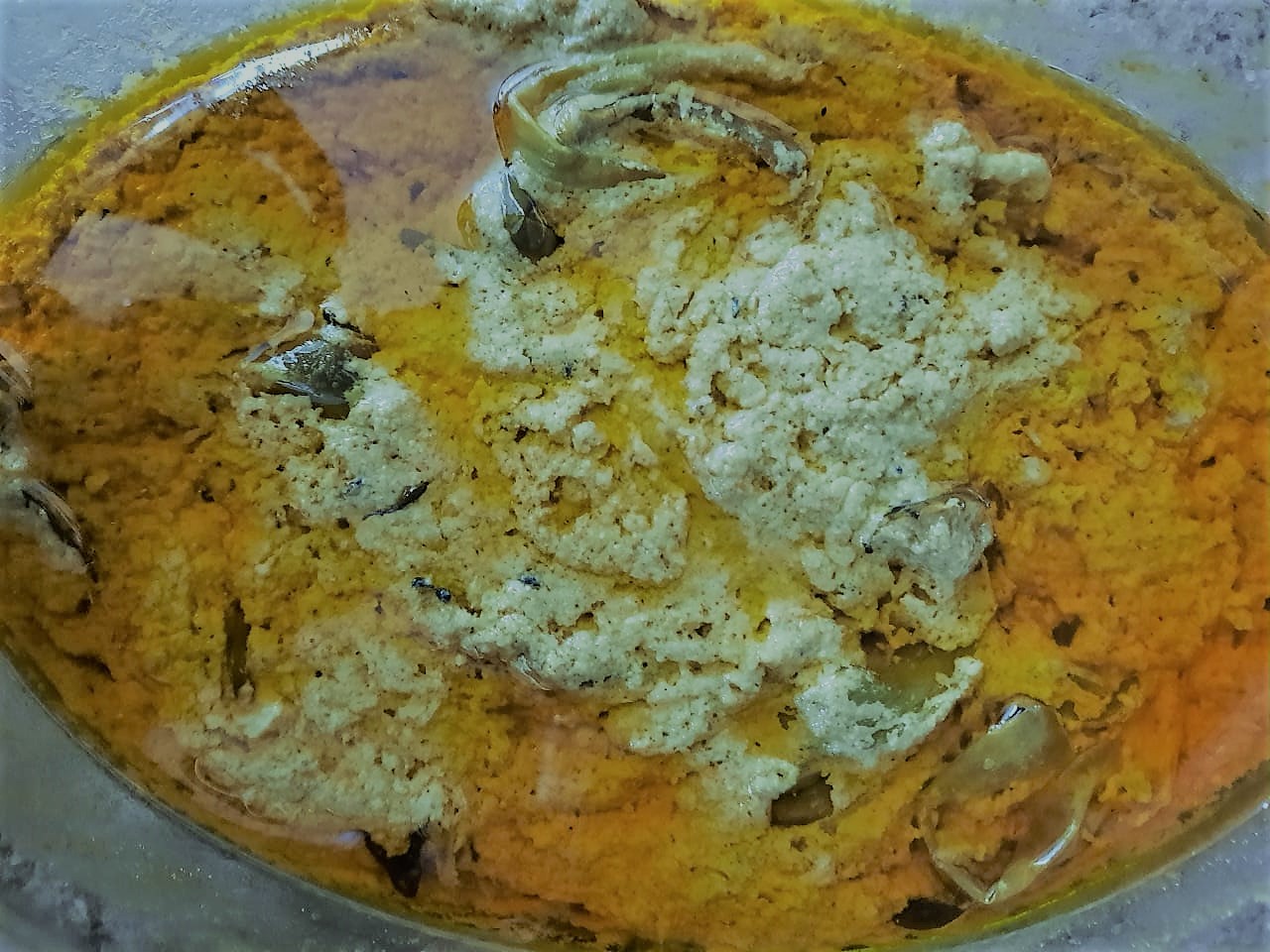Set the fried green chilies aside. Then in the same oil and saucepan add pinch of fenugreek, mustard seeds, dried curry leaves and ginger garlic paste. After the lovely fragrance add paste of onion and roasted dried fruits. Shortly after add cumin powder, coriander powder, turmeric powder and salt to taste. Let it cook for few minutes then add 4 tbsp.  yogurt.