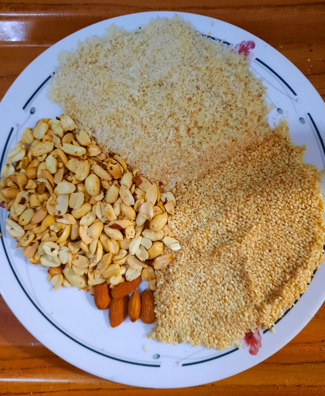 Roast the sesame seeds, peanuts,coconut powder and almonds in a fry pan one by one.