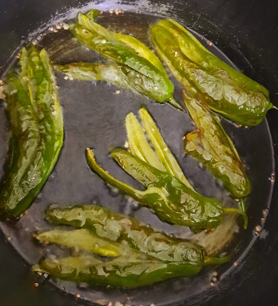 Take a saucepan and fried the Big green chilies in oil as shown in picture.